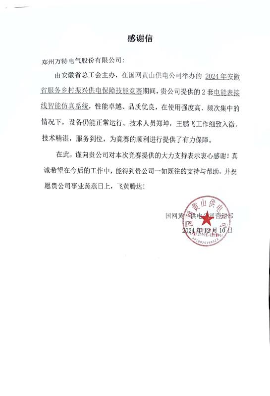 近日,公司收到了一封來自國網(wǎng)黃山供電公司營銷部的感謝信,信中高度贊揚(yáng)了公司在2024年安徽省服務(wù)鄉(xiāng)村振興供電保障技能競(jìng)賽中的卓越貢獻(xiàn)。